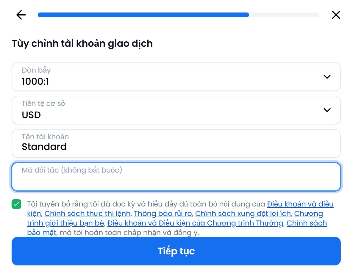 - Bước 3: Thiết lập thông số tài khoản: Chọn nền tảng giao dịch MT4 hoặc MT5, chọn loại tài khoản bất kỳ theo ý bạn (nên chọn tài khoản Standard để nhận Backcom cao nhất) và chọn đòn bẩy. Ở mục “Mã đối tác”, nhập mã “K3KPJ” rồi nhấn “Tiếp tục”.