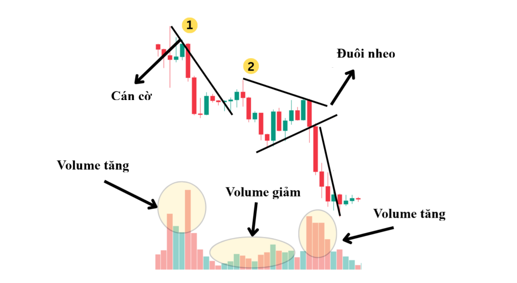 Cán Cờ: Đây là sự suy giảm mạnh và nhanh chóng ban đầu của giá, tạo thành một đường dốc thẳng đứng. Cán cờ thể hiện sức mạnh áp đảo của phe bán và động lượng giảm giá rất lớn. Chiều dài của cán cờ đóng vai trò quan trọng trong việc ước tính mục tiêu lợi nhuận sau khi mô hình hoàn thành.