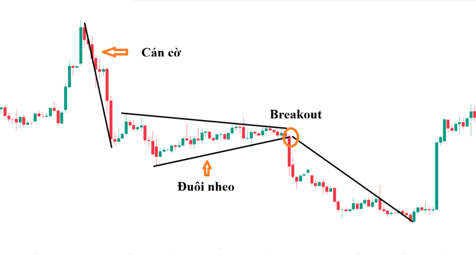 - Ý nghĩa: Lá cờ đuôi nheo thể hiện sự tạm thời cân bằng giữa lực mua và lực bán. Các nhà giao dịch đang chốt lời sau đợt giảm mạnh hoặc có một lực mua nhỏ lẻ tham gia, nhưng động lực này không đủ để đảo chiều xu hướng.