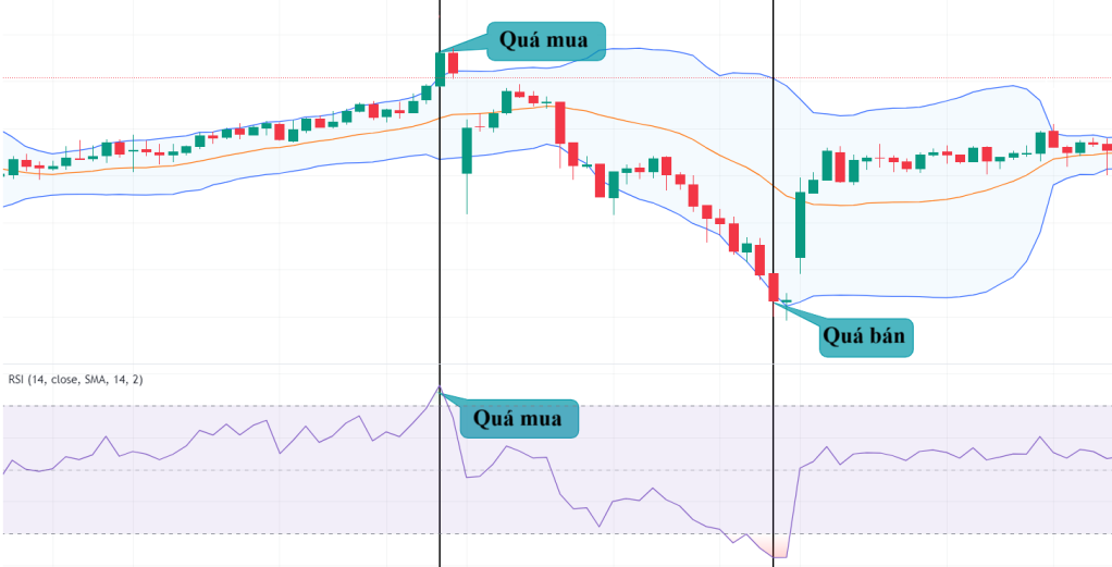 • Hiểu sai vùng quá mua/quá bán: Không phải cứ giá chạm dải trên là bán, chạm dải dưới là mua. Trong xu hướng mạnh, giá có thể bám dải rất lâu.
