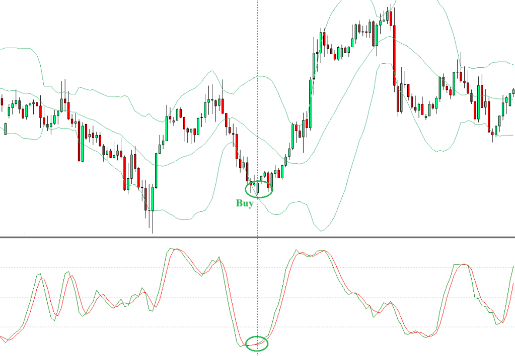 • Nếu giá chạm dải dưới Bollinger + Stochastic cắt lên khỏi vùng quá bán → tín hiệu mua.