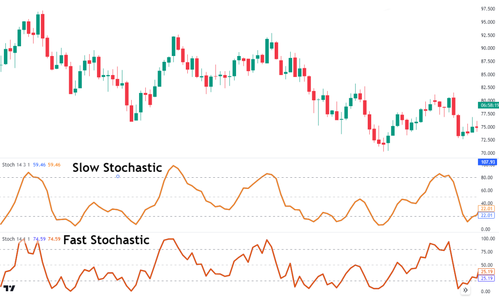 - Fast Stochastic: phản ứng nhanh với biến động giá, tín hiệu nhiều nhưng dễ nhiễu.