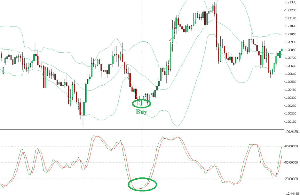 - Khi giá chạm biên dưới + Stochastic quá bán → tín hiệu mua.