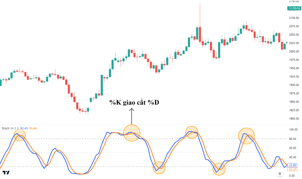 - %D: đường tín hiệu, thường là trung bình động 3 kỳ của %K, giúp làm mượt dữ liệu và đưa ra tín hiệu rõ ràng hơn.