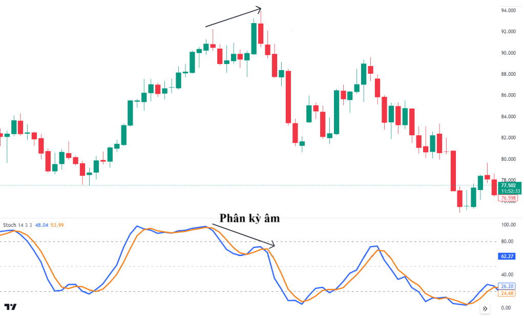 - Phân kỳ âm: bán khi giá tăng nhưng Stochastic cho thấy lực tăng yếu đi.