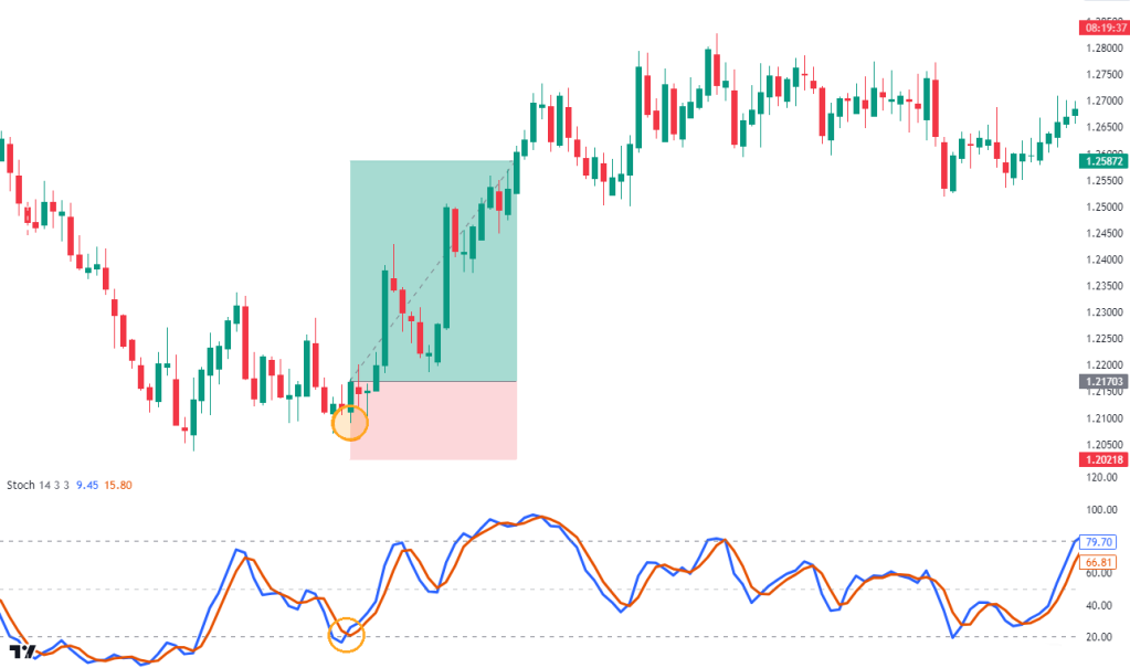- Khi Stochastic < 20 → Thị trường trong trạng thái quá bán. Đây là tín hiệu cảnh báo khả năng đảo chiều tăng.