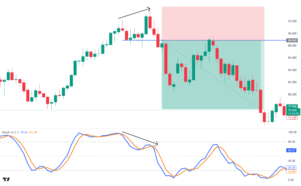 - Khi Stochastic > 80 → Thị trường đang trong trạng thái quá mua. Lúc này, khả năng điều chỉnh hoặc đảo chiều giảm có thể xảy ra.