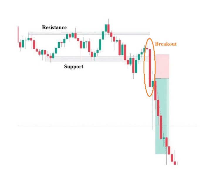 - Breakout: Mở lệnh ngay khi giá phá vỡ vùng tích lũy hoặc vượt qua ngưỡng kháng cự/hỗ trợ mạnh. Khi đà tăng hoặc giảm được xác nhận bằng khối lượng lớn, đó là tín hiệu rõ ràng của dòng tiền mạnh.