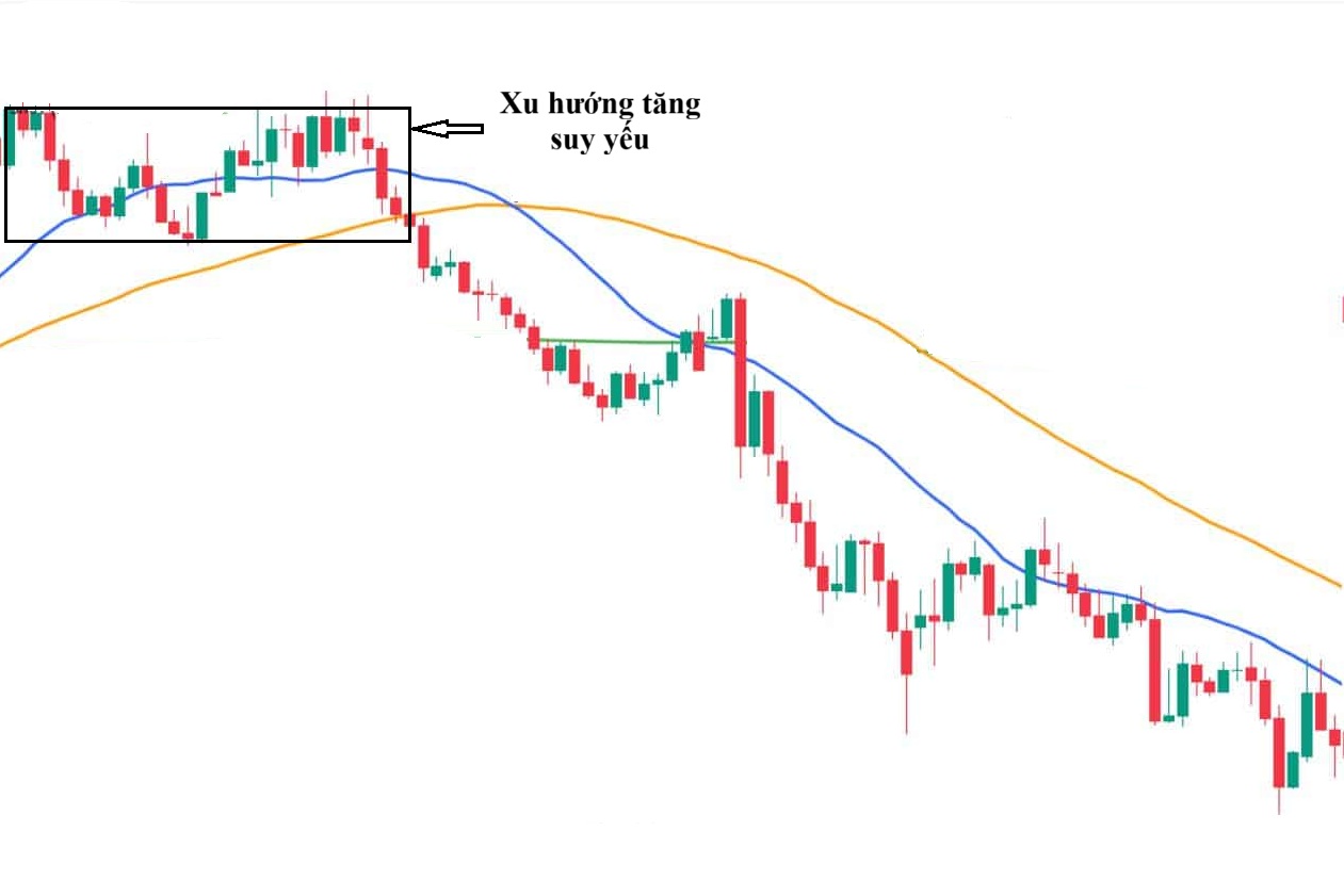Trong giai đoạn đầu, xu hướng tăng trước đó bắt đầu chững lại khi lực mua dần suy yếu. MA50 vẫn nằm trên MA200 nhưng không còn dốc lên mà dần chuyển sang đi ngang, đồng thời giá cũng có dấu hiệu giảm nhẹ hoặc biến động yếu. Đây là tín hiệu cảnh báo sớm cho thấy thị trường có thể đảo chiều, và nhà đầu tư thường cân nhắc giảm dần quy mô vị thế để hạn chế rủi ro.