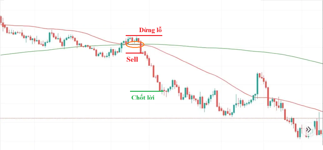 - Điểm vào lệnh: Mở vị thế bán khi giá chạm đến MA50 hoặc MA200 và xuất hiện tín hiệu từ chối, như nến rút chân hoặc mô hình đảo chiều giảm. Đây là vùng vào lệnh có lợi thế vì rủi ro thấp và tỷ lệ lợi nhuận/rủi ro cao.