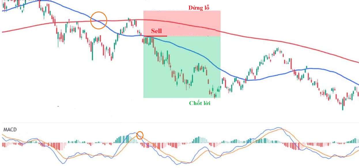 - Điểm vào lệnh: Bán khi Death Cross xảy ra đồng thời MACD cắt xuống đường tín hiệu. Sự đồng thuận giữa MA và MACD cho thấy xu hướng giảm đã chín muồi và có tính bền vững.