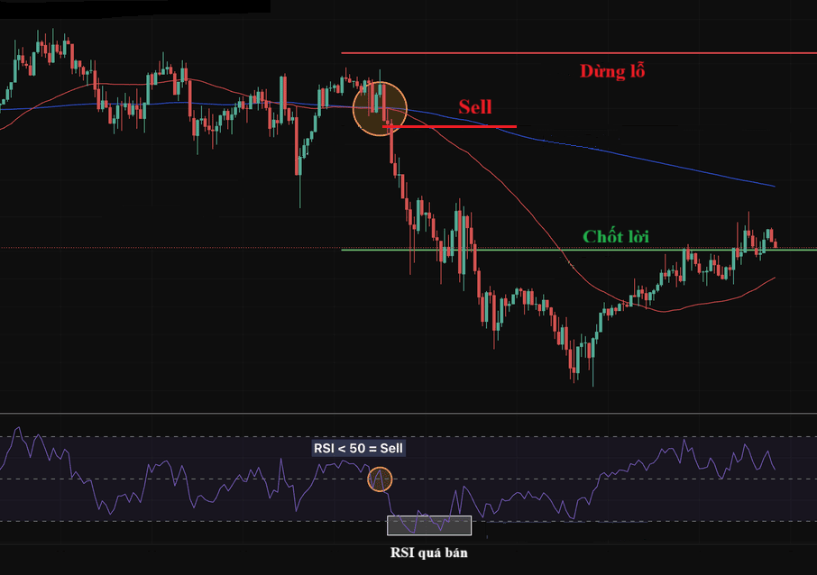 - Điểm vào lệnh: Mở vị thế bán khi Death Cross hình thành và RSI < 50. Điểm vào lệnh tối ưu là khi giá hồi lên MA50 hoặc MA200 và bị từ chối, đồng thời RSI vẫn duy trì dưới 50.