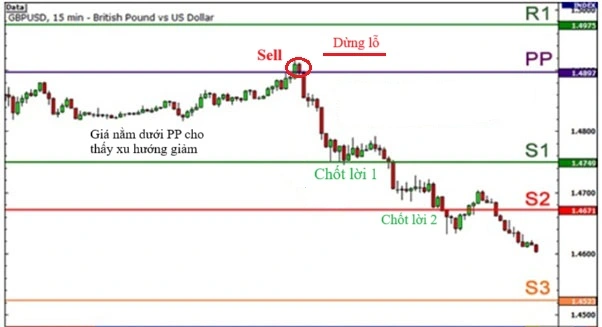 - Trong xu hướng giảm: Chờ giá hồi lên các mức kháng cự R1, R2 hoặc PP và tìm tín hiệu bán.