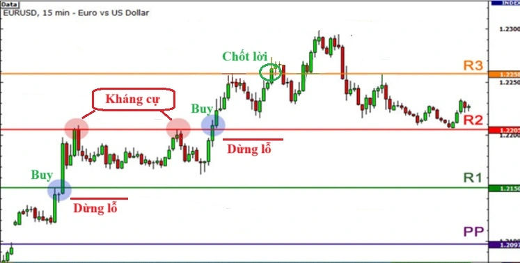 Dừng lỗ: Đặt ở phía đối diện của mức bị phá vỡ, ví dụ, ngay dưới R1 nếu mua khi giá phá vỡ R1.