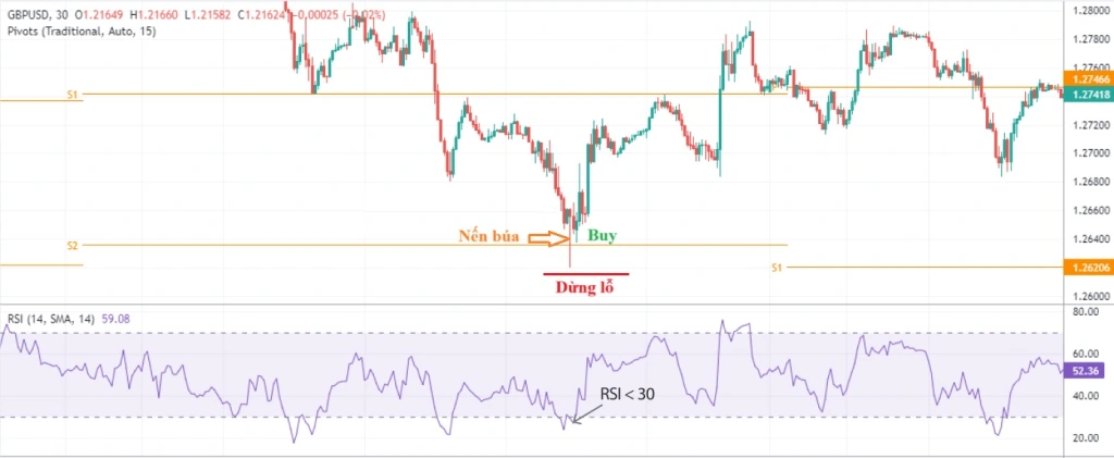 Nếu giá đạt đến một mức Pivot Points quan trọng và RSI đồng thời nằm trong vùng quá mua hoặc quá bán, tín hiệu đảo chiều sẽ được xác nhận mạnh mẽ hơn.