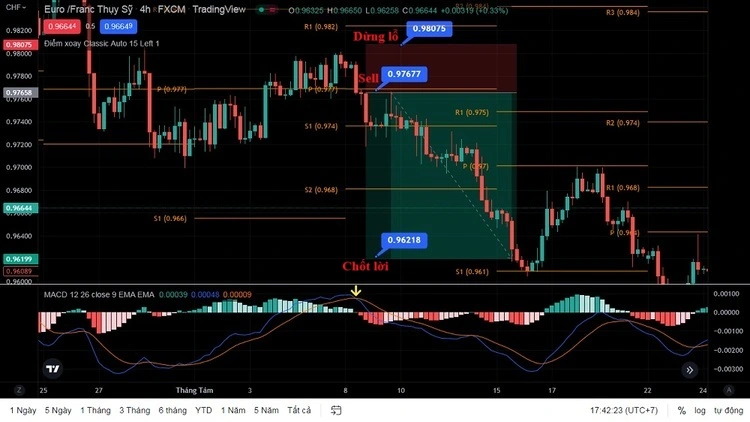 Khi giá tiếp cận một mức Pivot Point và đường MACD cắt từ dưới lên đường tín hiệu hoặc cắt từ phía trên xuống, tín hiệu đảo chiều hoặc tiếp diễn xu hướng sẽ mạnh mẽ hơn.