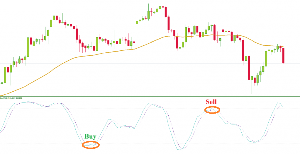 - Nếu MA50 báo xu hướng tăng và Stochastic rơi vào vùng quá bán dưới 20 rồi đảo chiều đi lên → tín hiệu mua.