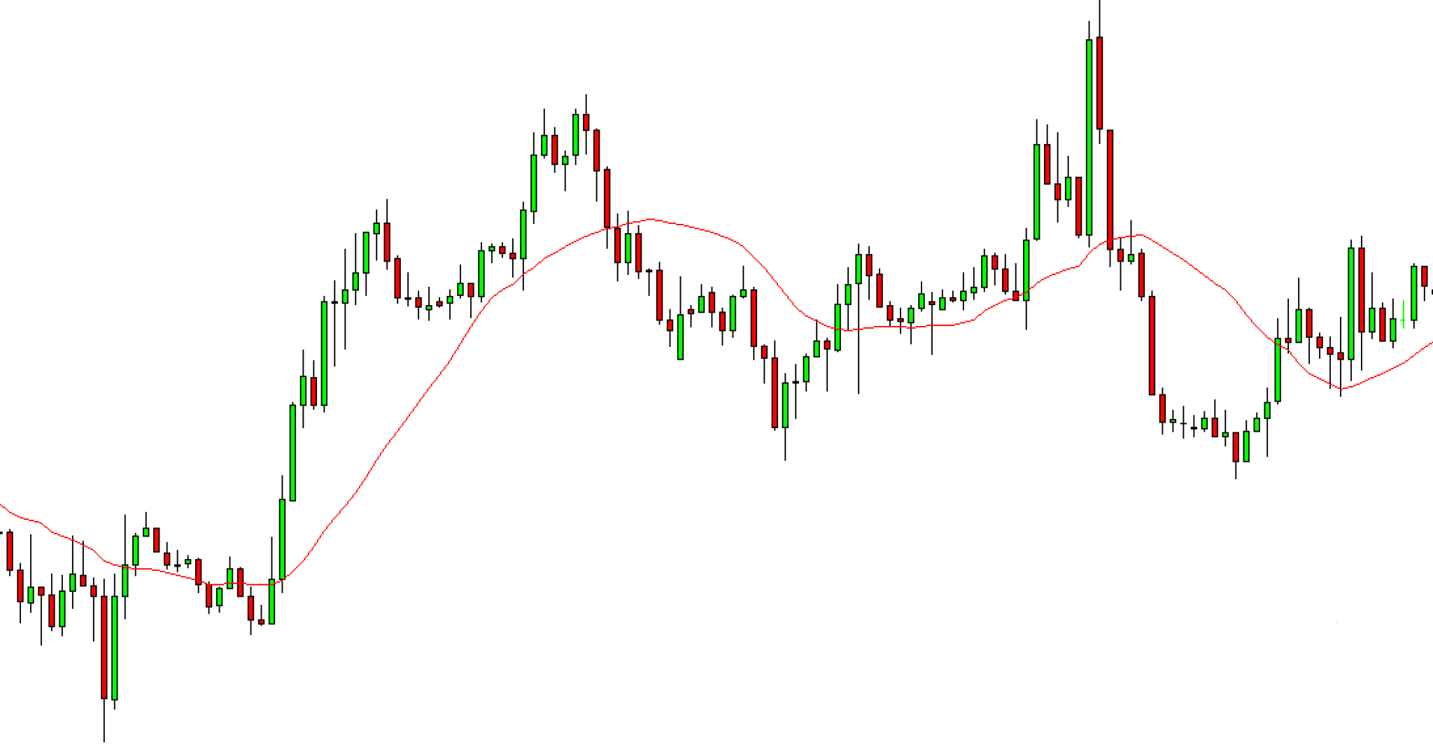 Thay vì nhìn vào những biến động phức tạp trong từng cây nến, MA sẽ tính toán giá trung bình của một tập hợp nến trong khoảng thời gian xác định. Kết quả là một đường cong thể hiện mức giá trung bình đó và di chuyển cùng với biến động giá.