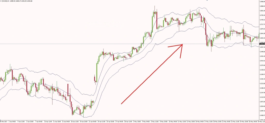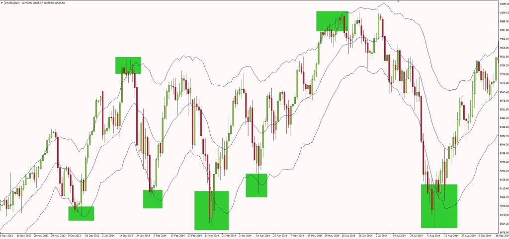 - Xác định xu hướng: Trong một xu hướng tăng, giá thường duy trì ở phía trên đường giữa hoặc chạm đường trên, cho thấy động lượng tăng mạnh. Ngược lại, trong xu hướng giảm, giá thường nằm dưới đường giữa hoặc chạm đường dưới.