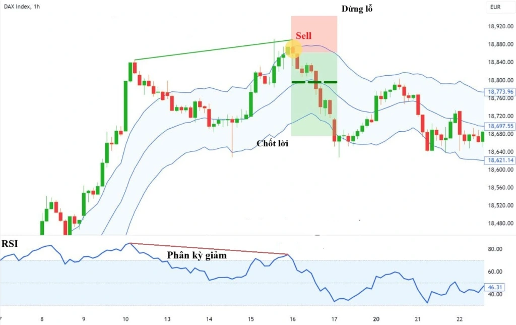 - Bán khi giá chạm đường trên và RSI trên 70. Đặt dừng lỗ trên đường trên, chốt lời gần đường dưới.