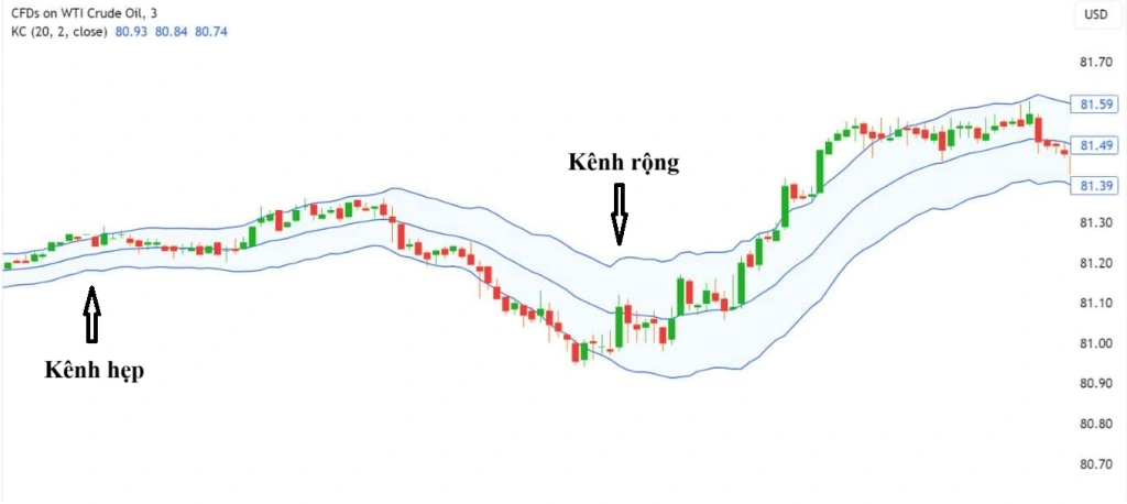 - Đo lường biến động: Độ rộng của kênh phản ánh mức độ biến động. Kênh rộng cho thấy biến động cao, thích hợp cho chiến lược giao dịch phá vỡ. Kênh hẹp chỉ ra biến động thấp, thường là giai đoạn tích lũy trước khi có một động thái giá lớn.