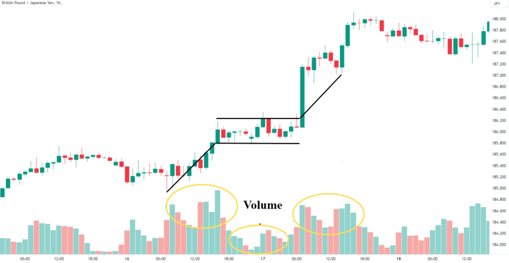 - Theo dõi khối lượng: Trong giai đoạn hình thành lá cờ, sự giảm dần của khối lượng là tín hiệu tích cực. Ngược lại, nếu khối lượng tăng lên khi giá điều chỉnh trong lá cờ, đó là dấu hiệu của áp lực bán thực sự, làm giảm độ tin cậy của mô hình.