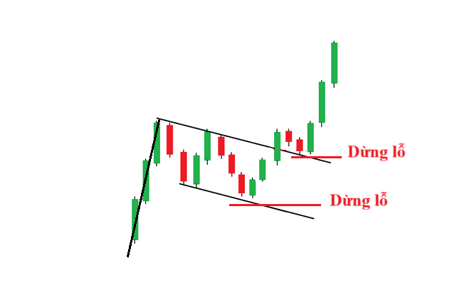 Vị trí dừng lỗ an toàn nhất là phía dưới đường hỗ trợ của lá cờ hoặc phía dưới đỉnh thấp nhất của lá cờ. Khoảng cách này nên đủ lớn để tránh bị quét bởi biến động nhỏ, nhưng không quá xa để kiểm soát rủi ro.