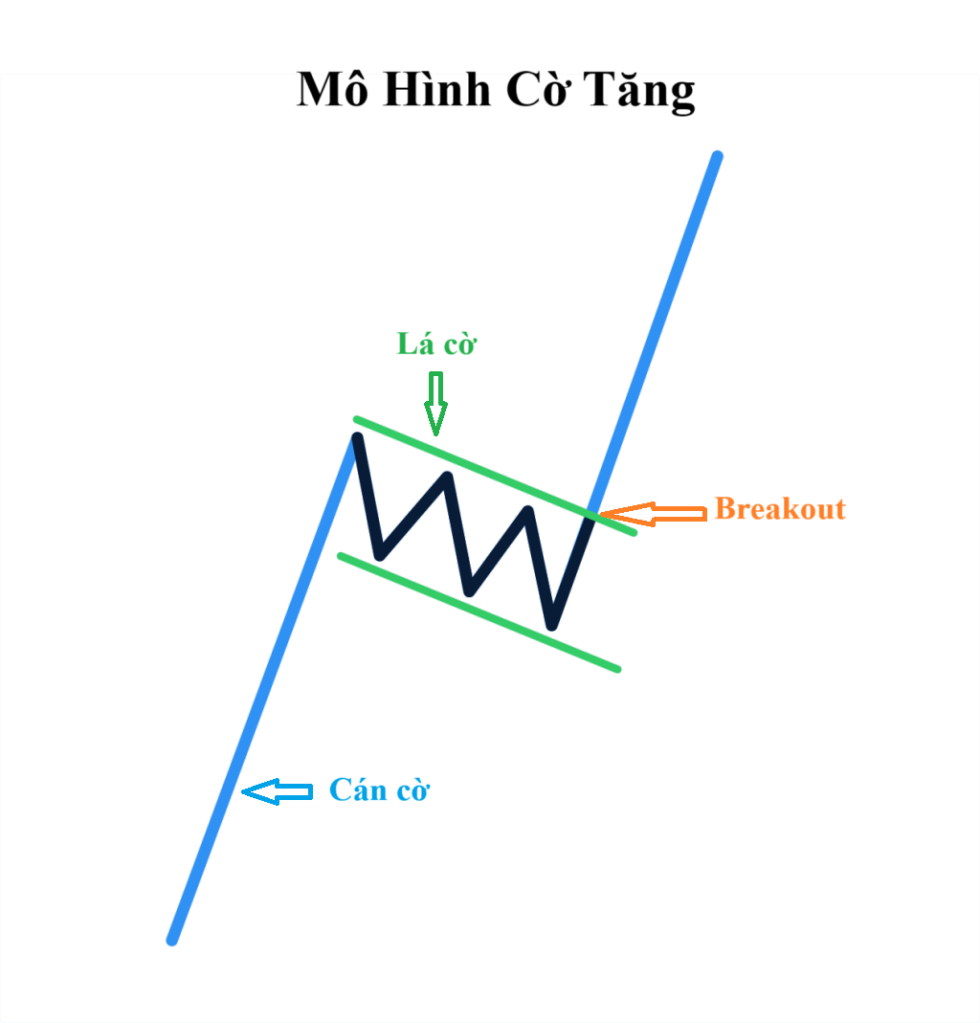 Mô hình cờ tăng phản ánh một giai đoạn tạm nghỉ của thị trường sau một đợt tăng giá mạnh. Trong giai đoạn lá cờ, các nhà đầu tư có thể chốt lời hoặc những người tham gia muộn bắt đầu mua vào, dẫn đến sự điều chỉnh giá tạm thời. Khi giá phá vỡ lên trên kênh lá cờ, điều này thường báo hiệu sự tiếp diễn của xu hướng tăng, với lực đẩy mạnh mẽ từ dòng tiền mới. Mô hình này đặc biệt hữu ích vì nó cung cấp tín hiệu rõ ràng về thời điểm mua vào và mục tiêu giá tiềm năng.