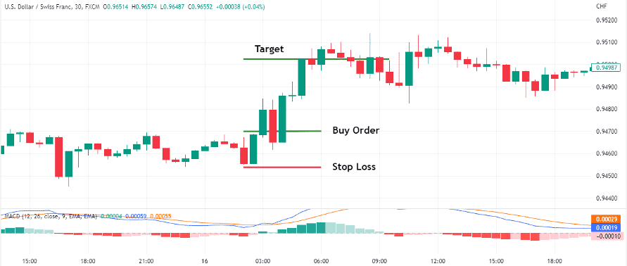 - Vào lệnh bằng lệnh chờ: Đặt lệnh Buy Stop ngay trên mức cao nhất của cây nến tăng trong mô hình. Hoặc đặt lệnh Buy Limit tại mức thấp của cây nến tăng để mua vào khi giá hồi về.