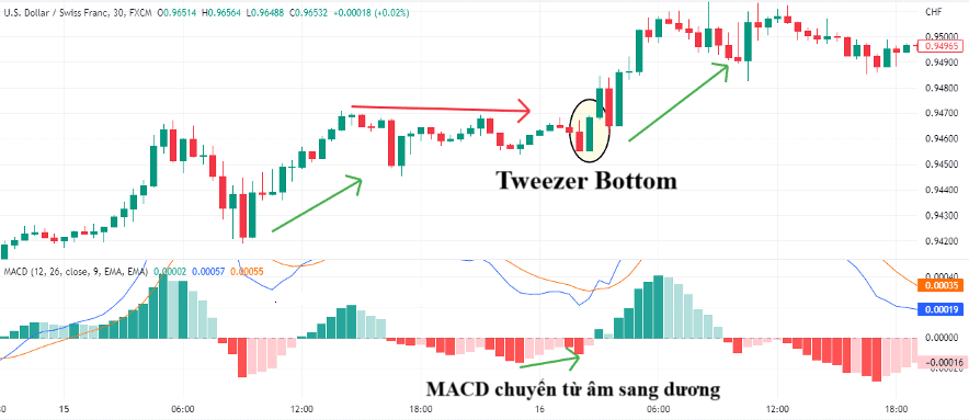 - RSI: RSI cho tín hiệu phân kỳ dương tại thời điểm Tweezer Bottom xuất hiện. Điều này có nghĩa là giá tạo đáy thấp hơn nhưng chỉ báo lại tạo đáy cao hơn, báo hiệu động lượng giảm đang yếu đi.