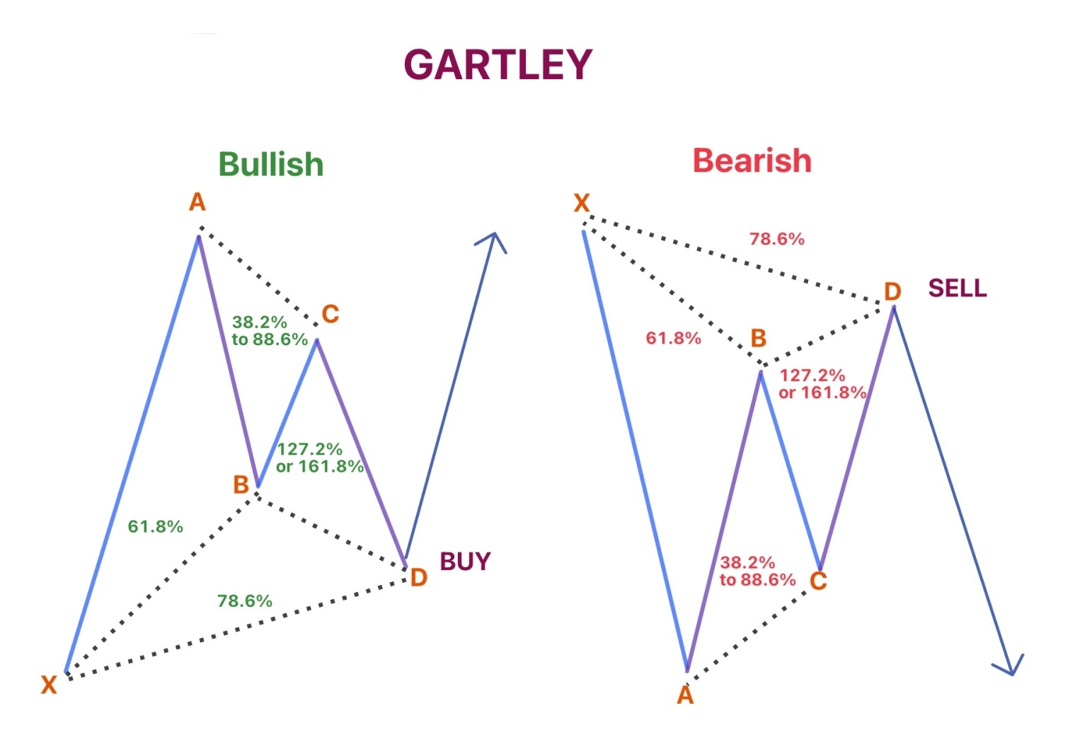 Ý nghĩa: Gartley thể hiện một nhịp điều chỉnh sâu trong xu hướng hiện tại. Khi giá chạm mức 78.6% XA ở điểm D, thị trường thường bật mạnh để tiếp tục xu hướng ban đầu. Vì cấu trúc của Gartley là dạng hồi rồi tiếp diễn, mô hình này rất phù hợp cho những ai giao dịch theo xu hướng.