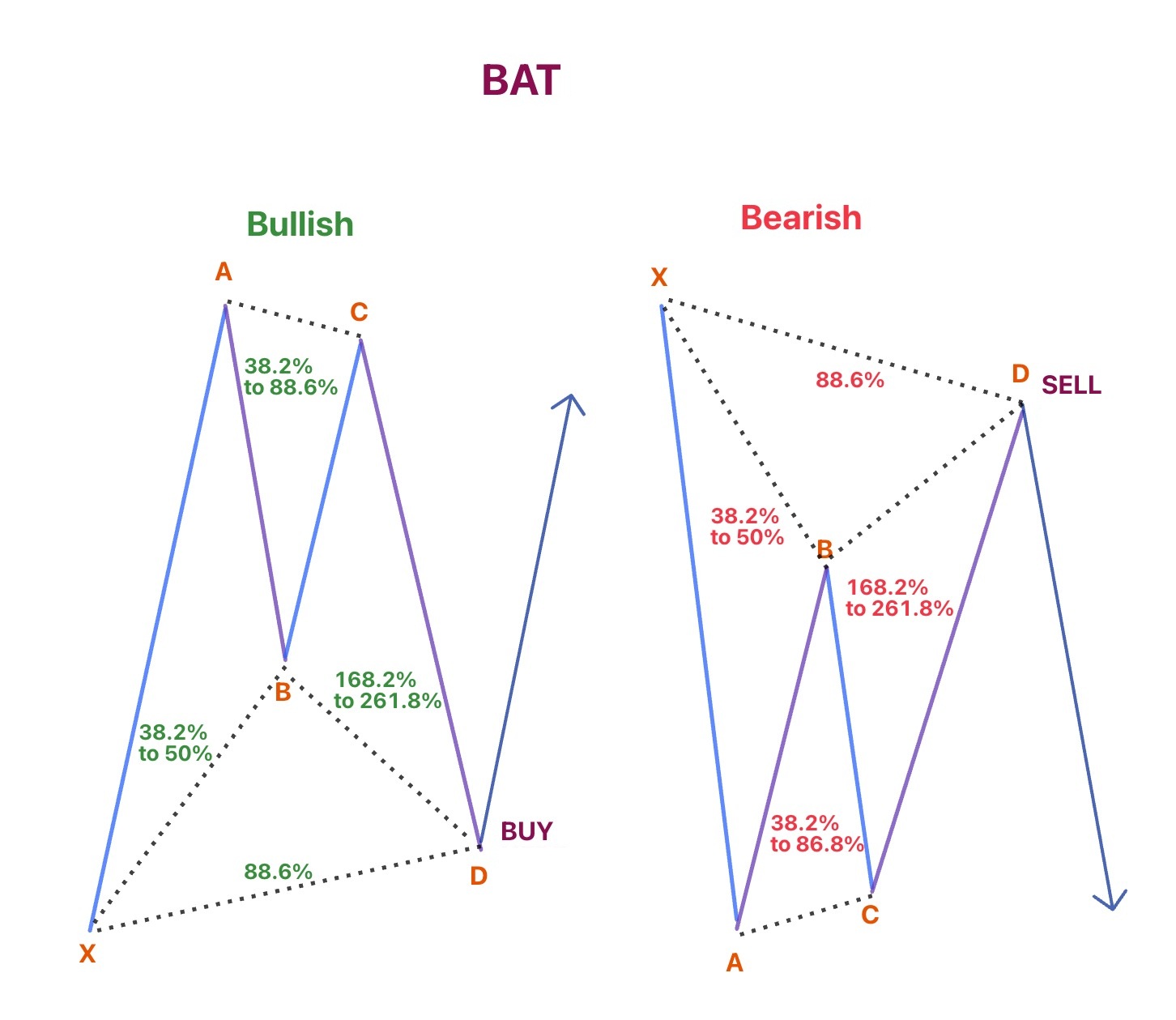 Ý nghĩa: Bat có điểm D sâu hơn Gartley, giúp tạo vùng đảo chiều có lực bật tốt. Vì vậy, khi Bat hoàn chỉnh, giá thường đảo chiều mạnh và ổn định hơn. Trader đánh giá Bat có tỷ lệ thắng cao nếu điểm D trùng với vùng hỗ trợ/kháng cự mạnh.