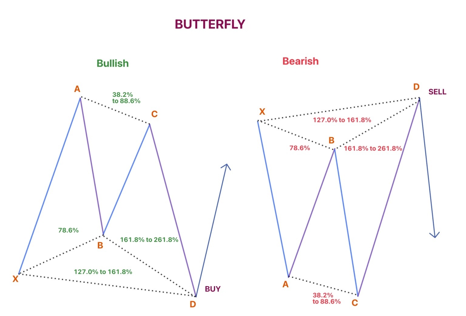 Ý nghĩa: Butterfly xuất hiện ở cuối xu hướng khi giá đã bị đẩy quá mức. Điểm D mở rộng vượt khỏi X cho thấy thị trường đang vào vùng quá mua hoặc quá bán cực mạnh, thường tạo điều kiện để đảo chiều lớn diễn ra. Đây là mô hình phù hợp để bắt đỉnh – đáy khi có xác nhận mạnh từ hành vi giá.