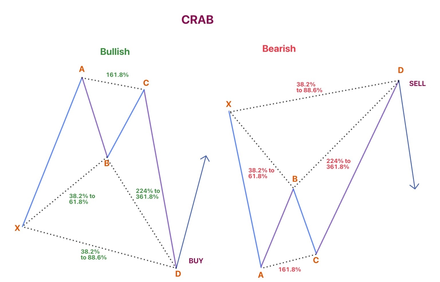 Ý nghĩa: Crab tạo ra điểm D rất xa và cực kỳ nhạy cảm với biến động. Khi chạm đúng mốc Fibonacci 1.618 của XA, thị trường thường đảo chiều rất mạnh. Tuy nhiên vì CD mở rộng sâu nên mô hình này yêu cầu đặt stop-loss hợp lý để tránh rủi ro bị nhiễu trước khi đảo chiều.