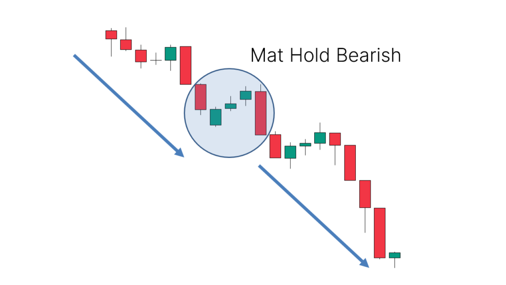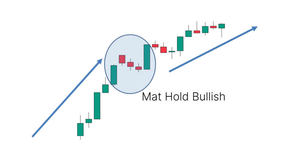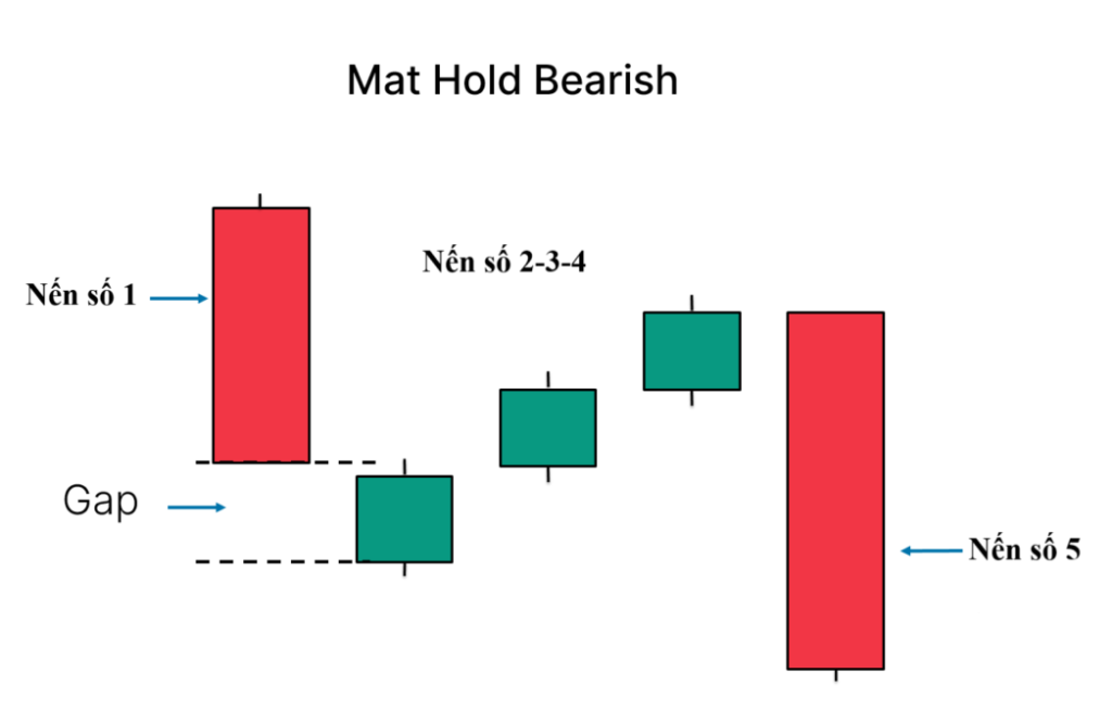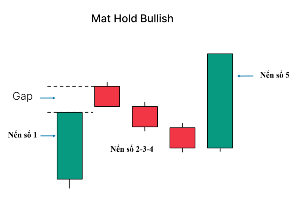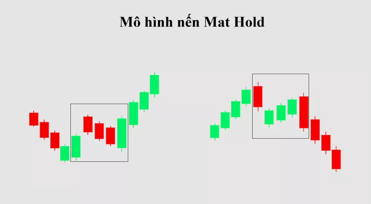 Mô hình nến Mat Hold là một mô hình tiếp diễn xuất hiện trong xu hướng tăng hoặc giảm, báo hiệu rằng xu hướng hiện tại có khả năng sẽ tiếp tục sau một giai đoạn điều chỉnh ngắn.