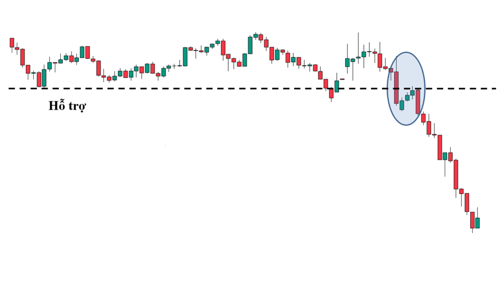 - Đối với Mat Hold giảm: Nếu mô hình nến Mat Hold giảm xuất hiện gần một mức hỗ trợ quan trọng và phá vỡ nó, điều đó cho thấy phe bán đã thành công trong đẩy giá vượt qua mức này. Sự xuất hiện của nến số 5 xác nhận rằng giá đã phá vỡ đường hỗ trợ và xu hướng giảm sẽ tiếp tục.