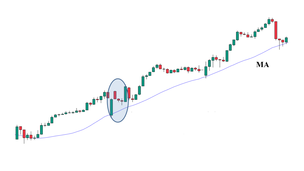 - Đối với Mat Hold tăng: Trong giai đoạn ba nến điều chỉnh, giá có thể giảm xuống và chạm vào một đường MA quan trọng. Sự xuất hiện của nến số 5 với giá đóng cửa bật lên từ đường MA này là một tín hiệu cực kỳ mạnh mẽ. Nó cho thấy đường MA đang đóng vai trò là một vùng hỗ trợ động, củng cố thêm ý tưởng rằng xu hướng tăng sẽ tiếp diễn.