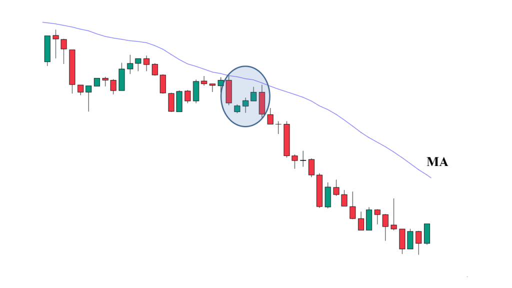 - Đối với Mat Hold giảm: Trong giai đoạn ba nến điều chỉnh, giá có thể tăng lên và chạm vào một đường MA quan trọng. Sự xuất hiện của nến số 5 với giá đóng cửa bị từ chối và giảm xuống từ đường MA này là một tín hiệu mạnh mẽ. Điều này cho thấy đường MA đang hoạt động như một vùng kháng cự động, xác nhận rằng xu hướng giảm sẽ tiếp tục.