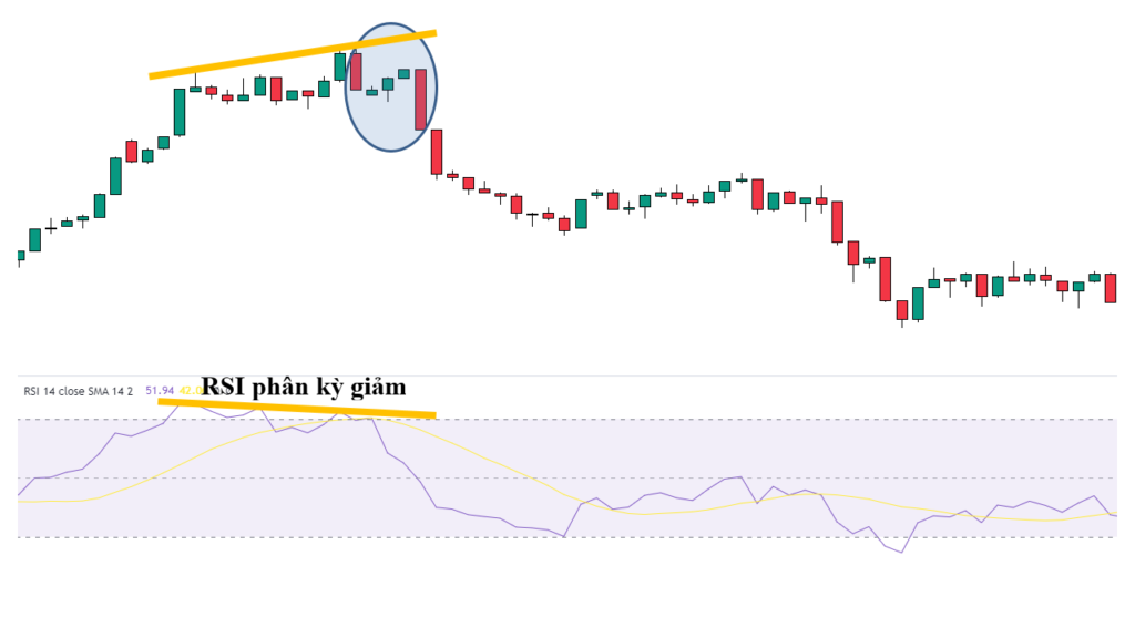 - Kiểm tra xem RSI có tạo các đáy thấp hơn trong khi giá tạo các đáy cao hơn, đây chính là dấu hiệu RSI phân kỳ giảm.