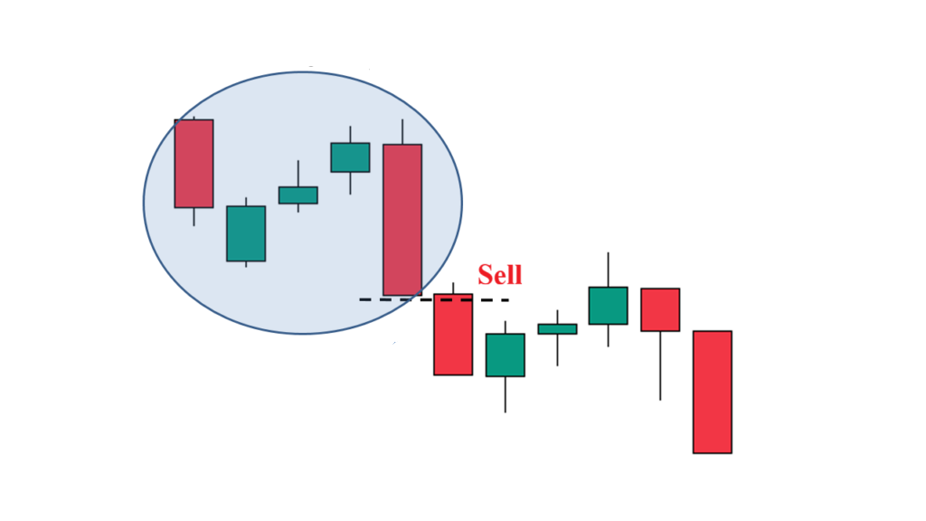 - Vào lệnh khi nến thứ năm đóng cửa dưới mức thấp nhất của nến đầu tiên.