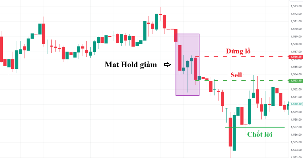 - Mat Hold giảm: Đặt stop loss ngay trên mức cao nhất của mô hình, thường là mức cao nhất của nến 1 hoặc nến 5.
