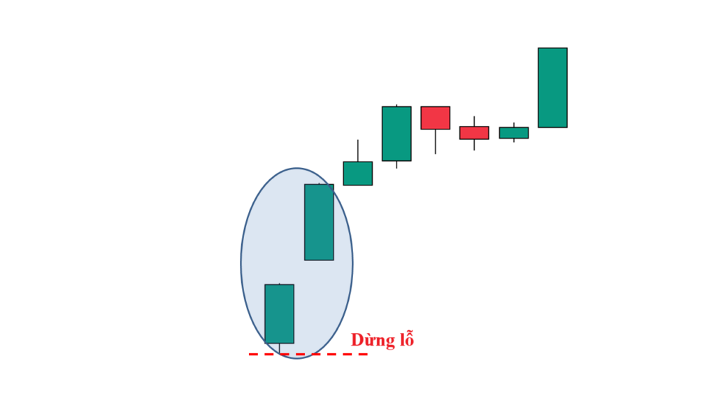 - Nến thứ hai: Cây nến này thường là một nến tăng, tiếp tục đẩy giá lên cao hơn và có giá đóng cửa cao hơn nến thứ nhất, xác nhận sự tiếp diễn của xu hướng.