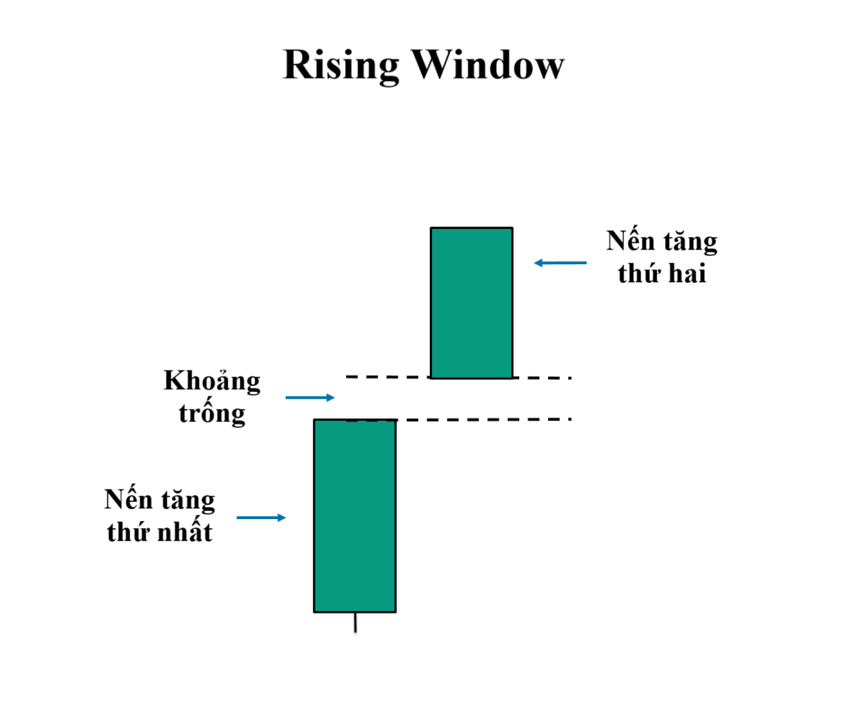 Mô hình nến Rising Window bao gồm hai cây nến chính và một khoảng trống giá, với các đặc điểm sau: