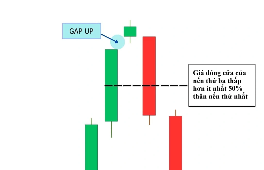 - Cây nến thứ ba: Cây nến thứ ba là một cây nến giảm giá mạnh, có thân dài, cho thấy phe bán đã hoàn toàn chiếm ưu thế và đẩy giá xuống thấp. Giá đóng cửa của cây nến này thấp hơn ít nhất 50% thân nến thứ nhất hoặc thậm chí có thể thấp hơn giá mở cửa của cây nến thứ nhất. Sự xuất hiện của cây nến này xác nhận rằng xu hướng tăng đã kết thúc và một xu hướng giảm mới có thể bắt đầu.