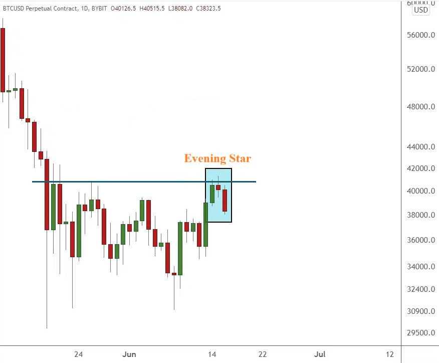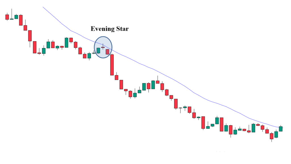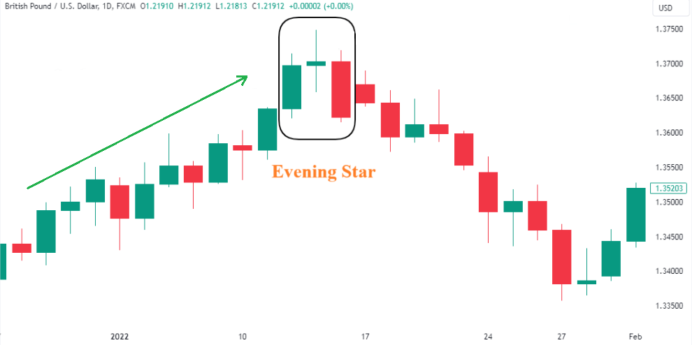 Mô hình nến sao hôm – Evening Star là một mô hình nến đảo chiều giảm giá mạnh, thường xuất hiện ở đỉnh của một xu hướng tăng. Nó báo hiệu rằng lực mua đang suy yếu và lực bán có thể sắp chiếm ưu thế, dẫn đến khả năng đảo chiều từ xu hướng tăng sang xu hướng giảm.