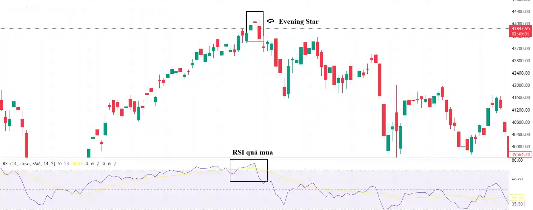 - RSI: Nếu RSI nằm trong vùng quá mua khi mô hình nến sao hôm xuất hiện, đây là một xác nhận mạnh mẽ cho tín hiệu đảo chiều giảm giá. Nhà giao dịch có thể mở vị thế bán.