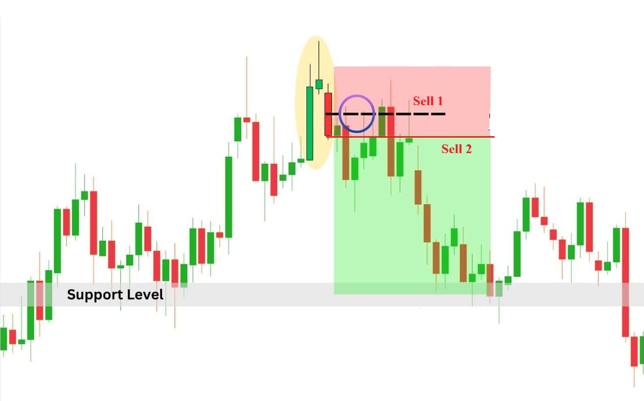 - Có thể vào lệnh bán ngay khi cây nến thứ ba đang trong quá trình hình thành, đặc biệt nếu nó cho thấy áp lực bán rất mạnh và khối lượng giao dịch tăng cao. Tuy nhiên, cách này tiềm ẩn rủi ro cao hơn vì mô hình chưa được xác nhận hoàn toàn.