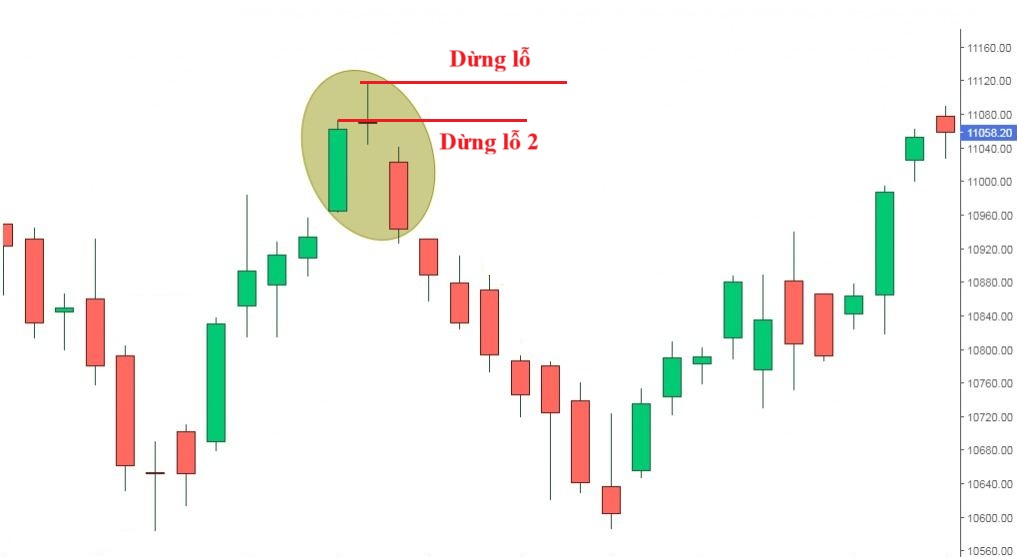 - Đặt dừng lỗ ở phía trên đỉnh cao nhất của cây nến thứ hai hoặc đỉnh cao nhất của cây nến thứ nhất.
