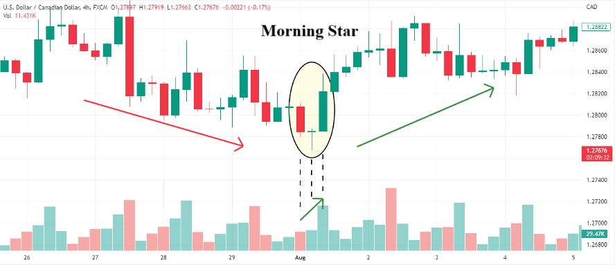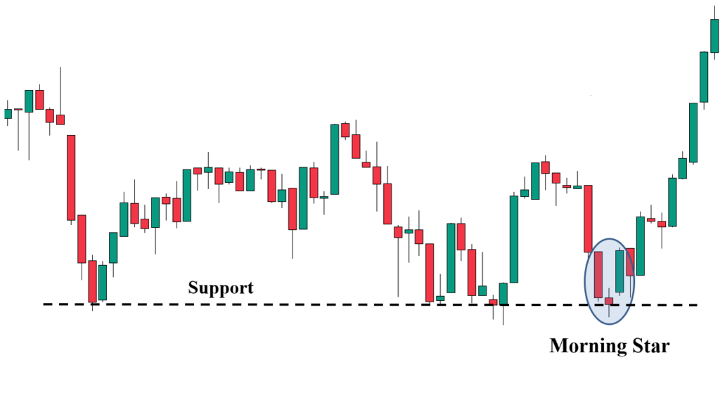 - Dễ nhận biết: Mô hình nến sao mai có cấu trúc rõ ràng với ba cây nến, dễ dàng được nhận diện trên biểu đồ giá.