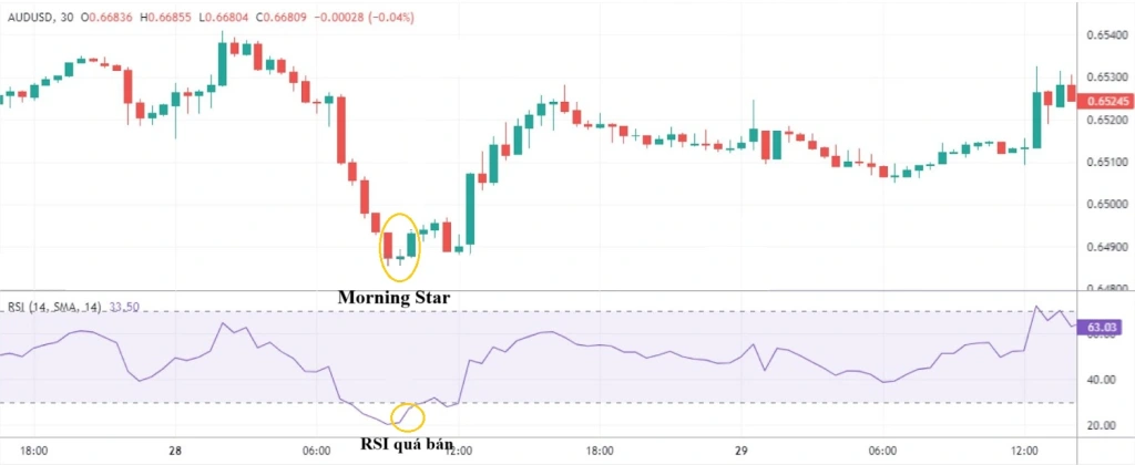 - RSI: Nếu RSI nằm trong vùng quá bán khi Morning Star xuất hiện, đây là tín hiệu mạnh cho thấy giá có khả năng đảo chiều tăng.